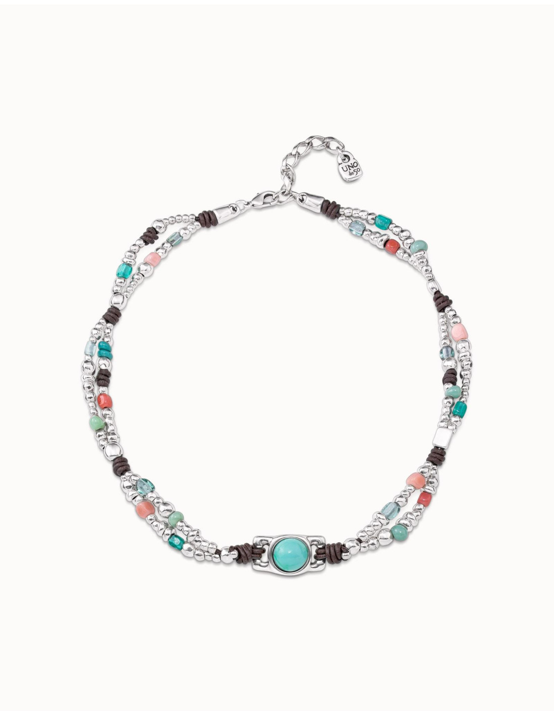 Collar cortito con mezcla de cuero, piezas metálicas y de cristal de murano en tonos alegres como rosa claro, coral, turquesa... Cadena regulable.