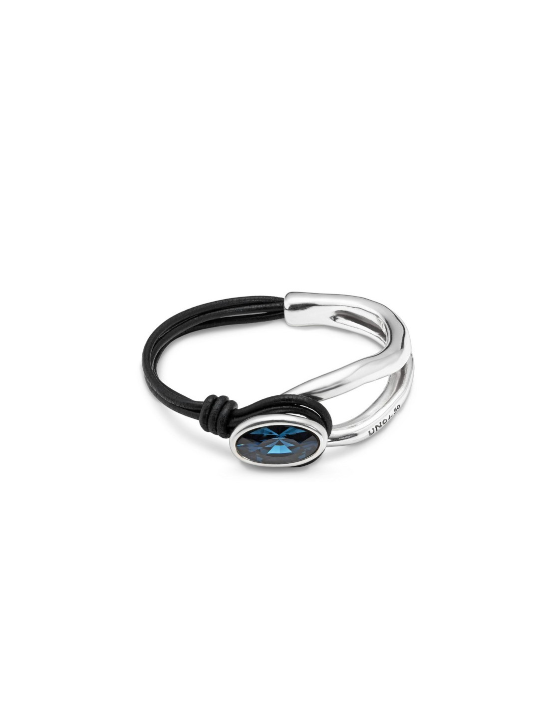 Pulsera de Uno de 50, divida en dos partes, una tipo caña con un diseño moderno y la otra parte con cuero auténtico que actúa como botón. Ambas partes finalizan en un precioso cristal de Swaroski en color azul noche.